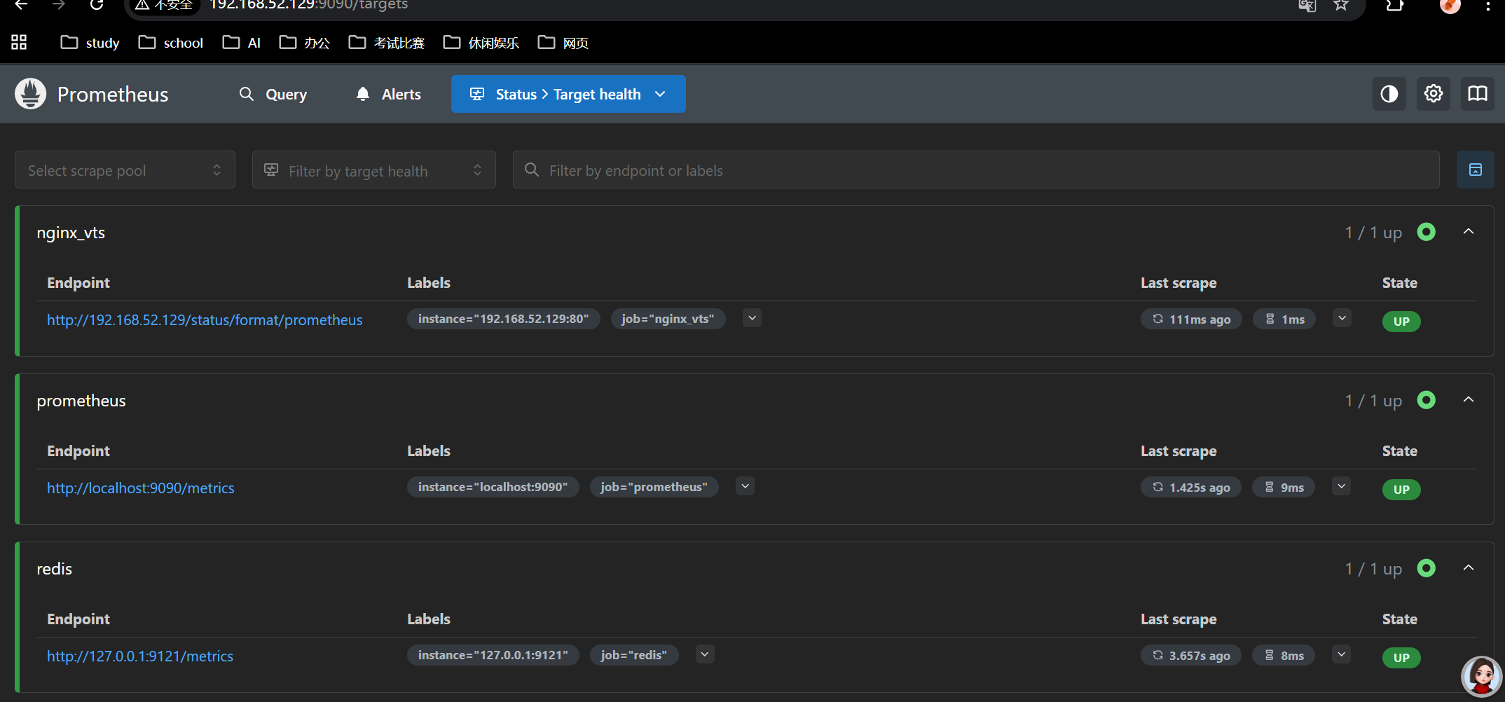 - 你会看到 Prometheus 的 Targets 页面,里面会列出 3 个采集任务: