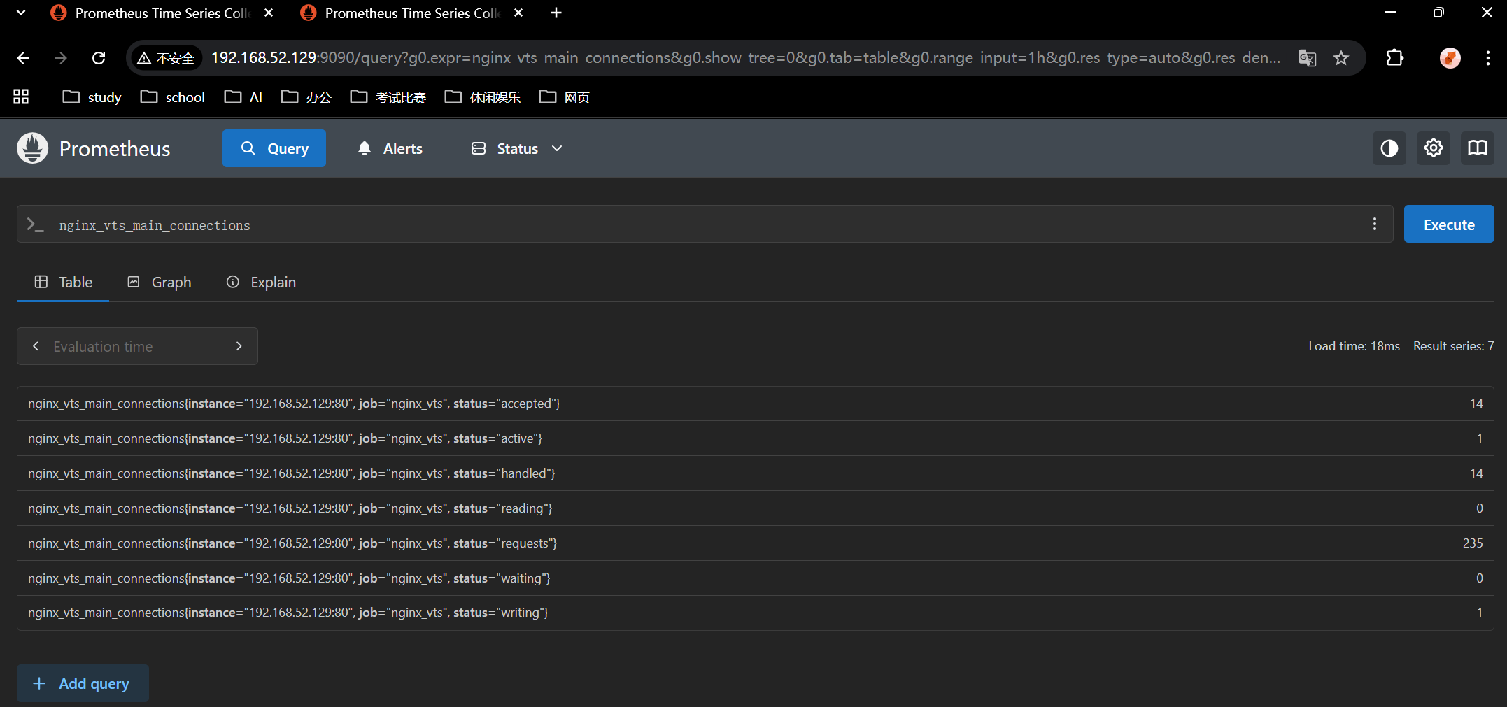 Execute按钮,就能看到 Nginx 的连接数指标数据(如果能看到,说明采集成功)
